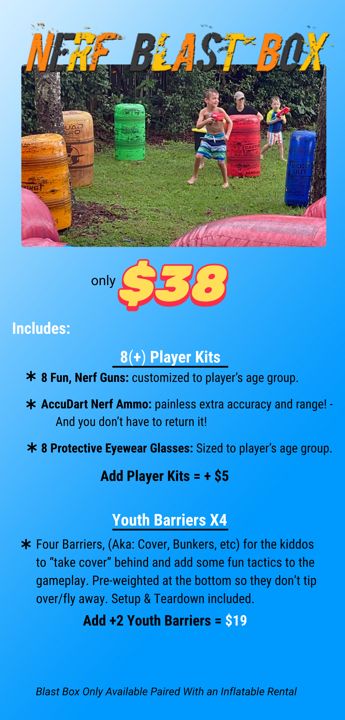 The tasty appetizer version of our Full Blast Games, add on a Nerf or Water Gun Fun (+ Water Tag) Blast Box to your Bouncer or Slide to add a whole lot of FUN to your fun!