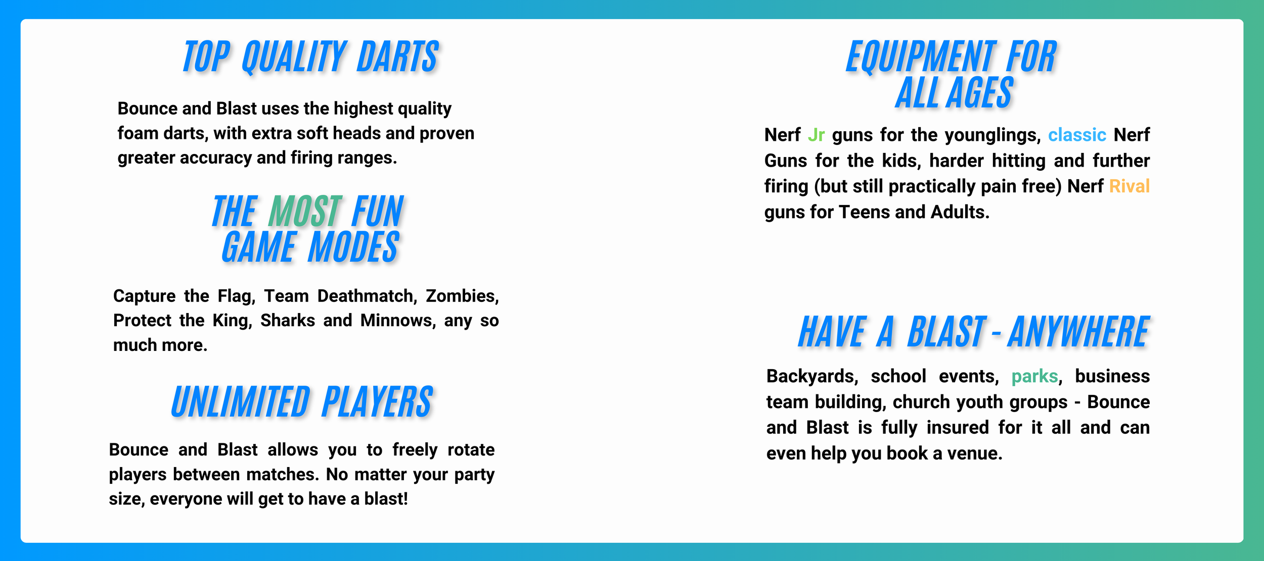 Nerf Wars can accommodate a large number of players and varying skill levels or ages! Contact us today to set up your custom Nerf War Event Package!